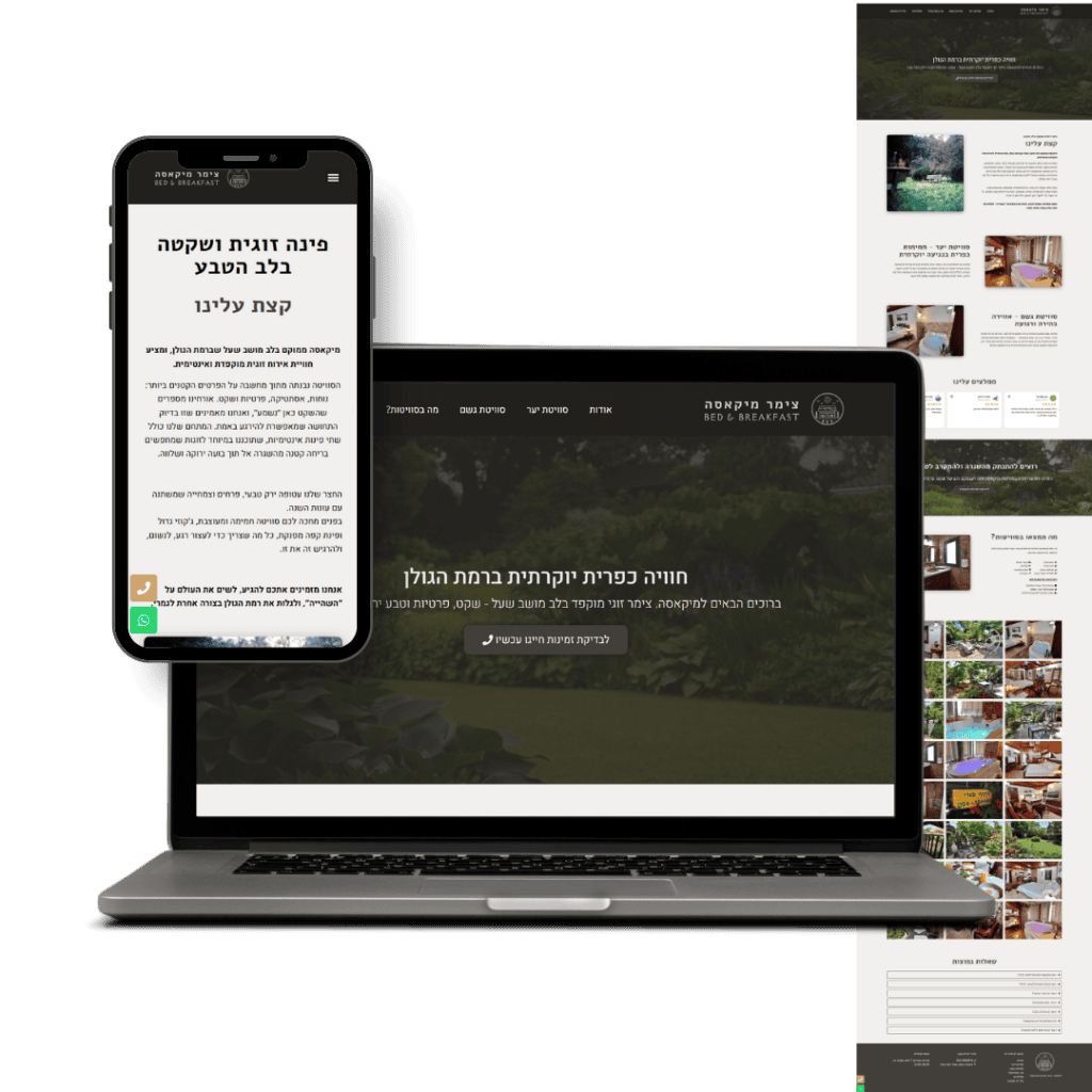 בניית אתר תדמית עבור Mikasa, מתחם אירוח זוגי במושב שעל שברמת הגולן. האתר מציג שתי סוויטות יוקרתיות, סוויטת יער וסוויטת גשם, עם דגש על אווירה אינטימית, עיצוב נקי, ג׳קוזי פרטי, מרפסות נוף וחוויית אירוח שקטה בלב הטבע. המבנה כולל גלריות נרחבות, מפרטי חדרים מסודרים, המלצות אורחים וקריאות לפעולה ברורות להזמנה ובדיקת זמינות.