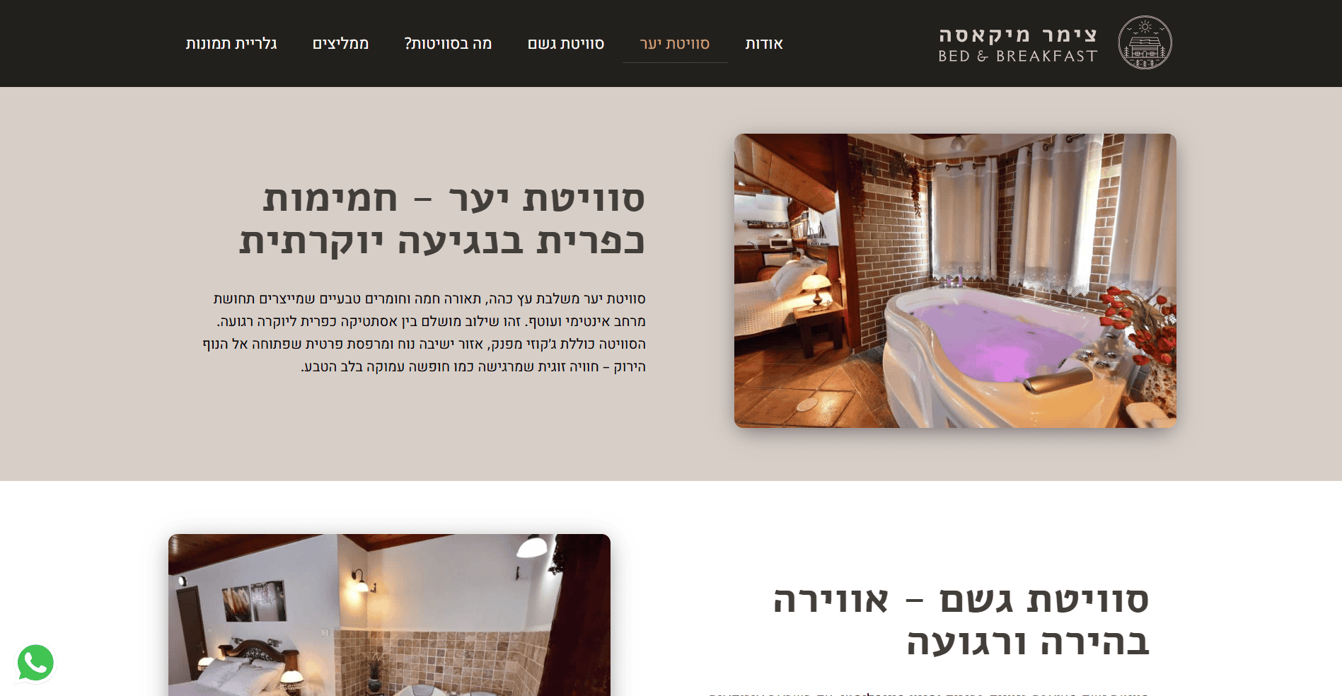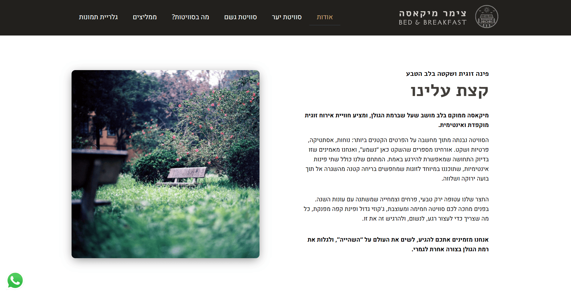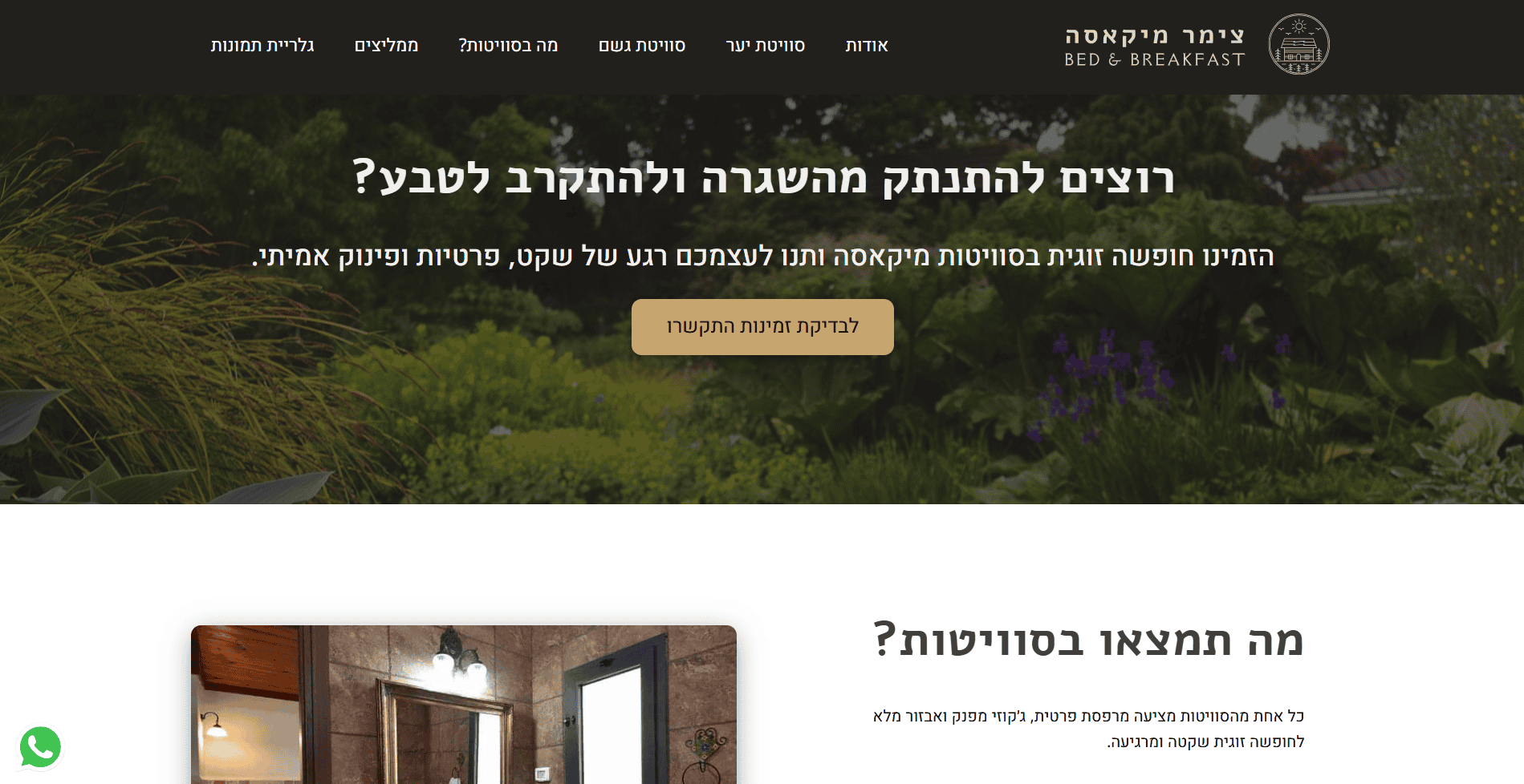 בניית אתר תדמית עבור Mikasa, מתחם אירוח זוגי מוקפד במושב שעל שברמת הגולן. האתר מציג שתי סוויטות יוקרתיות – סוויטת יער וסוויטת גשם – בעיצוב אינטימי ומאובזר, כולל ג׳קוזי, מרפסת פרטית וחוויית אירוח שקטה בלב הטבע. הפרויקט כלל יצירת שפה עיצובית רגועה ונקייה, צילום ותצוגת גלריות, הצגת מפרט הסוויטות, שילוב המלצות אורחים, וקריאות לפעולה ברורות לבדיקת זמינות והזמנה. הושם דגש על יצירת אווירה חמימה ואותנטית המייצגת את תחושת השקט, הפרטיות והפינוק שמיקאסה מציעה לזוגות שמחפשים בריחה מהשגרה.