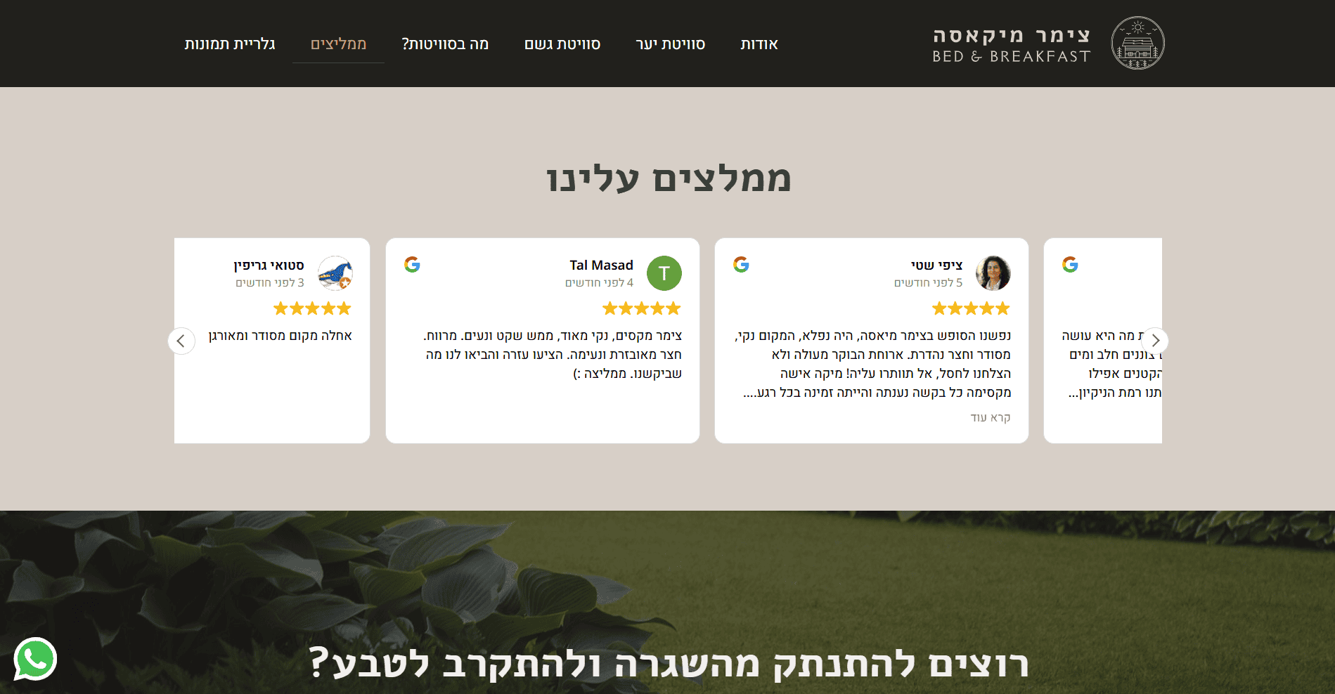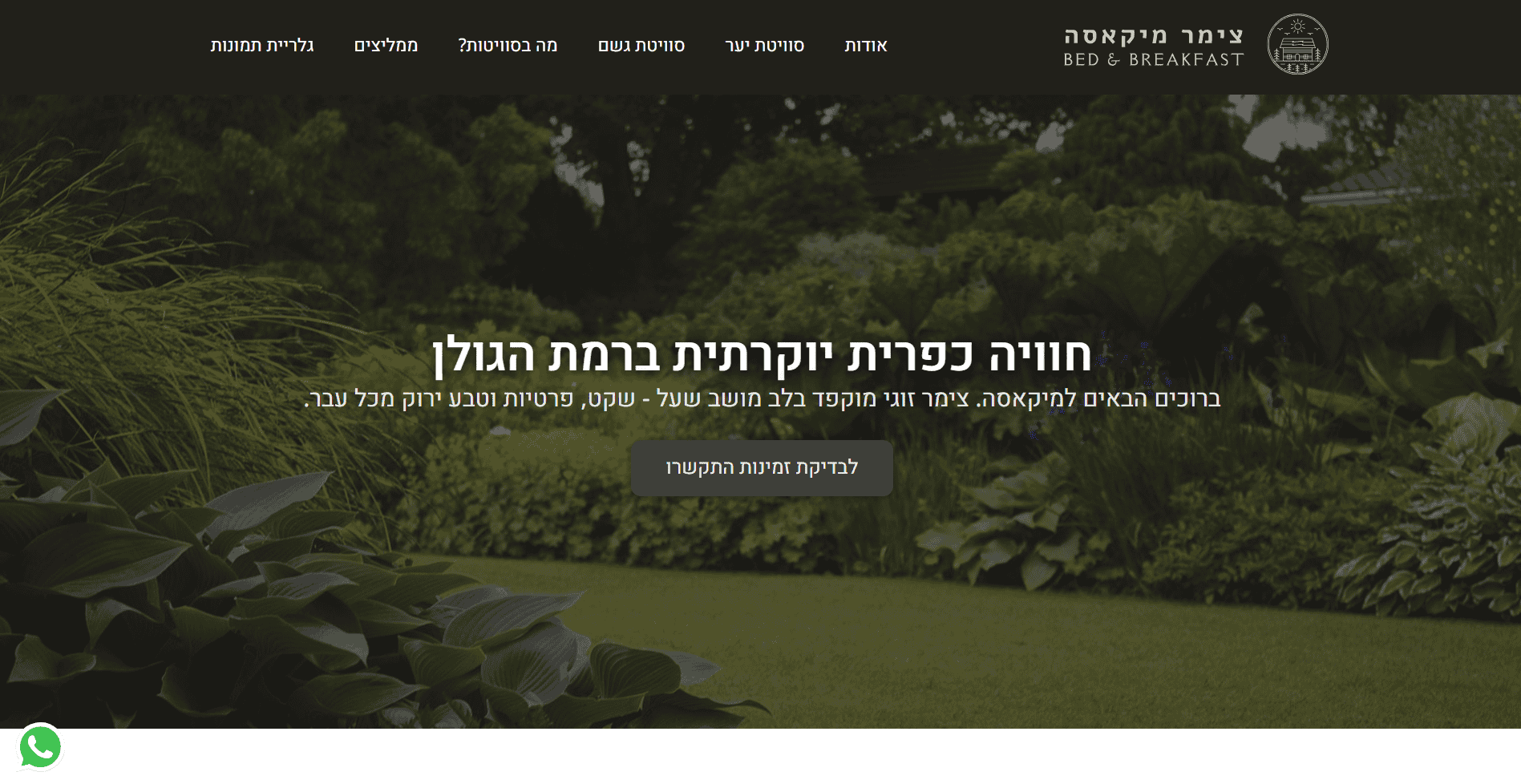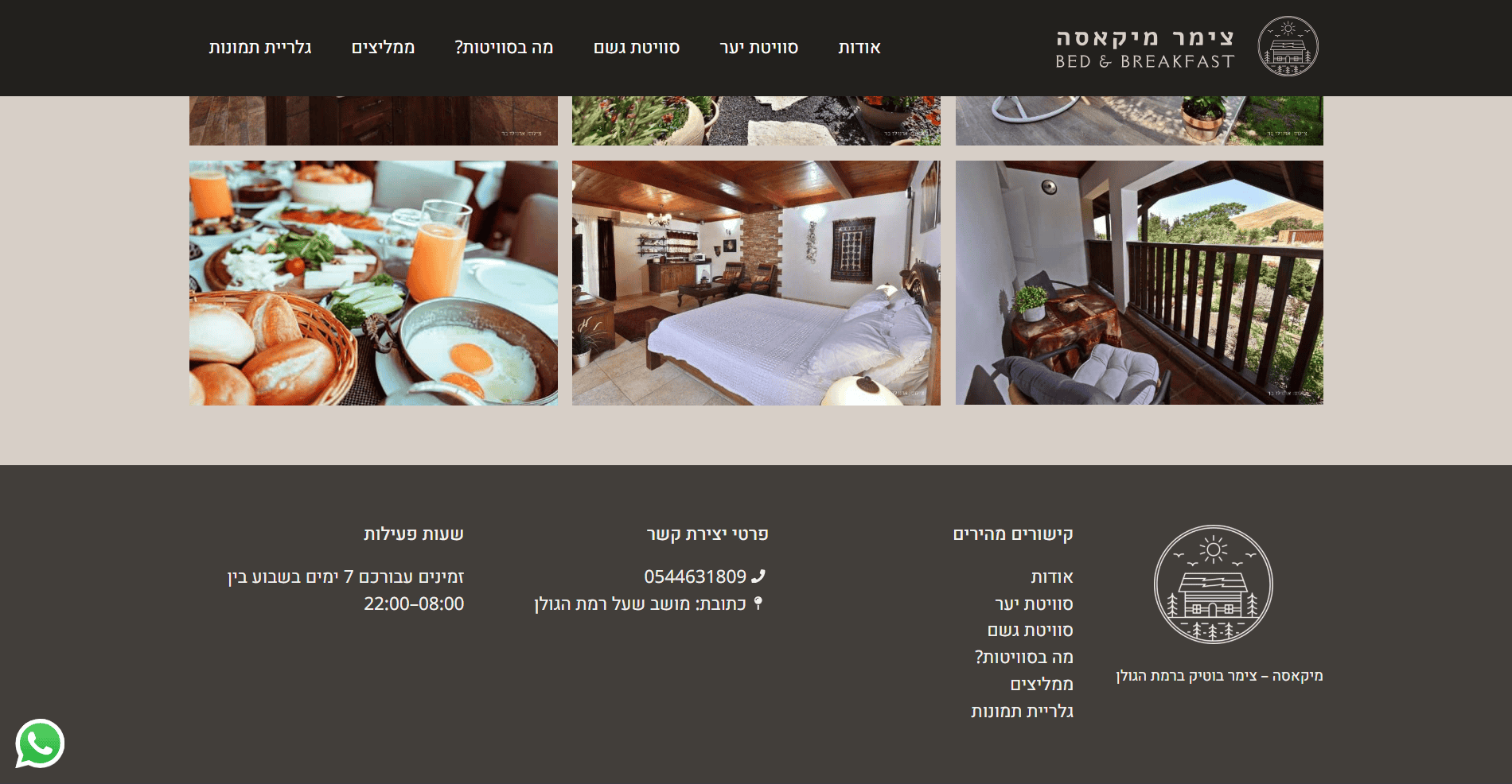 בניית אתר תדמית עבור Mikasa, מתחם אירוח זוגי מוקפד במושב שעל שברמת הגולן. האתר מציג שתי סוויטות יוקרתיות – סוויטת יער וסוויטת גשם – בעיצוב אינטימי ומאובזר, כולל ג׳קוזי, מרפסת פרטית וחוויית אירוח שקטה בלב הטבע. הפרויקט כלל יצירת שפה עיצובית רגועה ונקייה, צילום ותצוגת גלריות, הצגת מפרט הסוויטות, שילוב המלצות אורחים, וקריאות לפעולה ברורות לבדיקת זמינות והזמנה. הושם דגש על יצירת אווירה חמימה ואותנטית המייצגת את תחושת השקט, הפרטיות והפינוק שמיקאסה מציעה לזוגות שמחפשים בריחה מהשגרה.