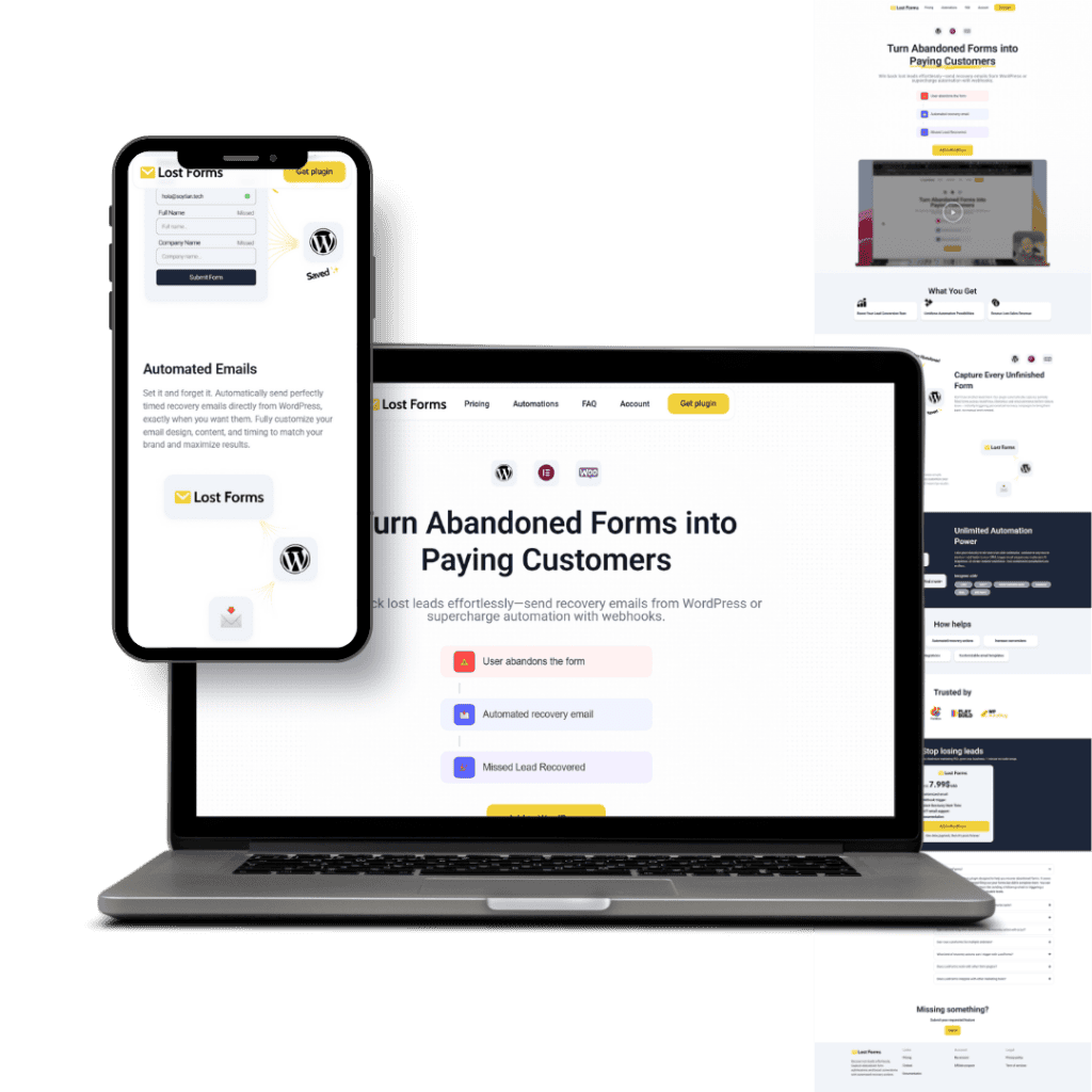 בניית אתר מוצר עבור LostForms, כלי ייעודי לבעלי אתרים שמאפשר זיהוי ושחזור של טפסים שלא הושלמו. המערכת מיועדת לאתרי WordPress ו WooCommerce ומטרתה לשפר המרות ולצמצם אובדן לידים.