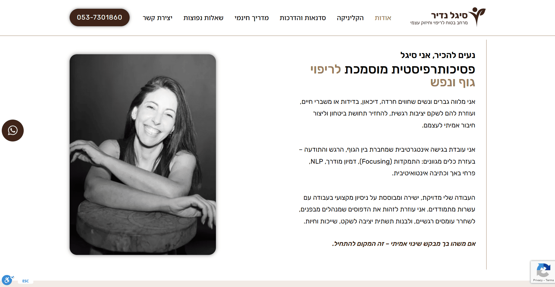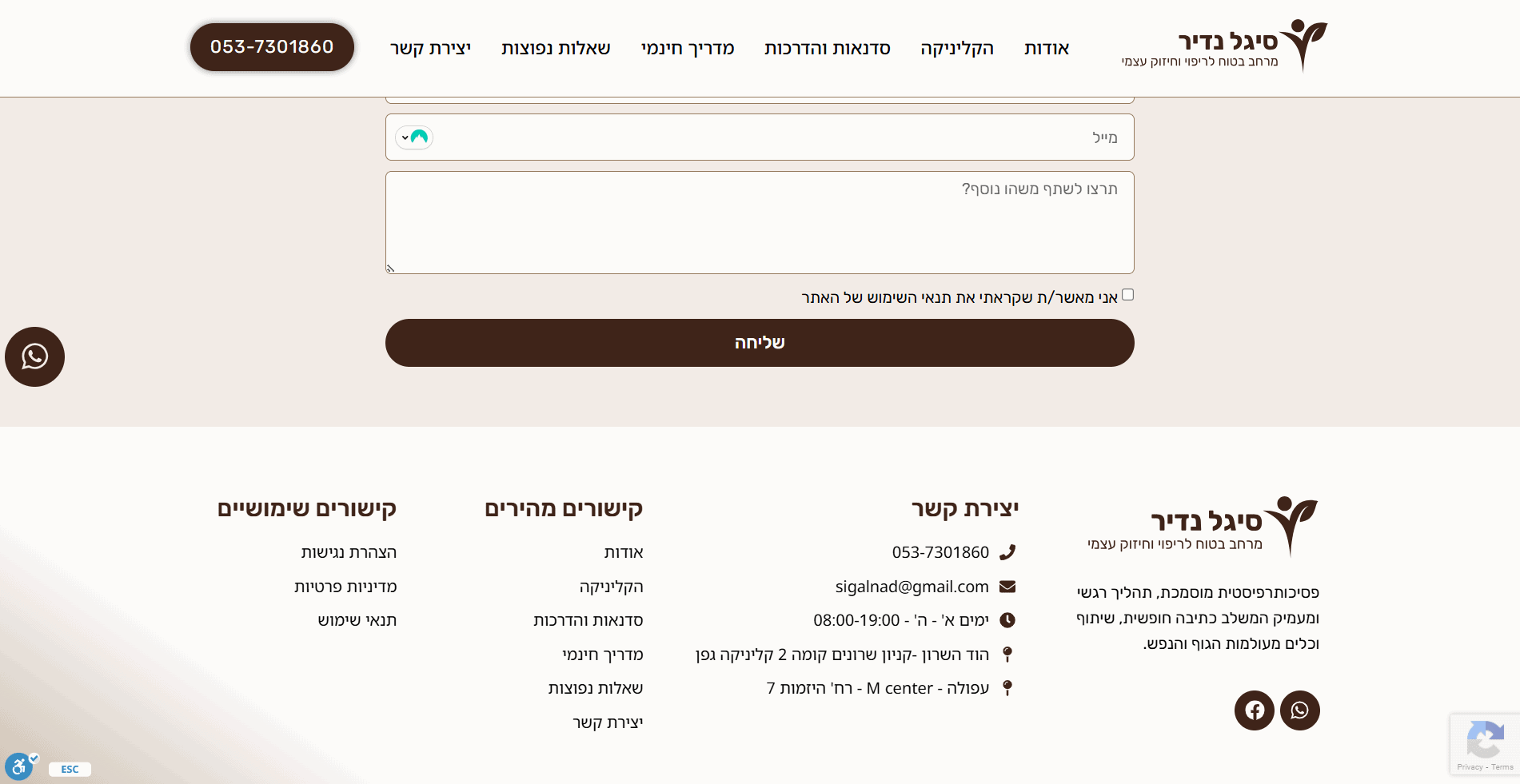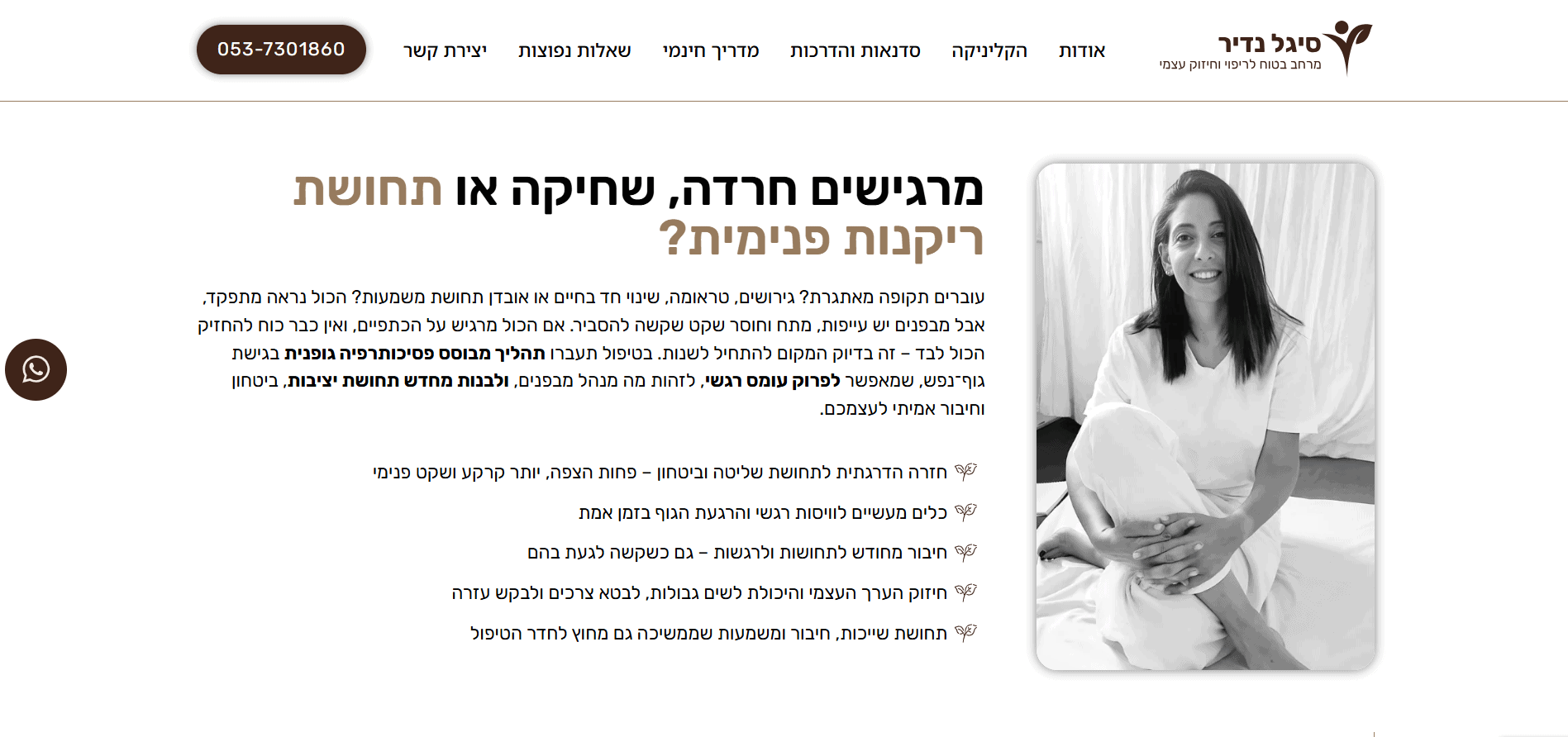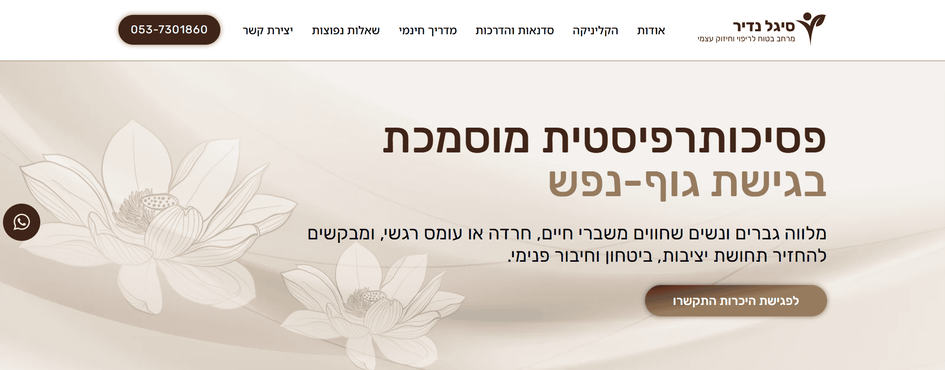 בניית אתר תדמית עבור סיגל נדיר, פסיכותרפיסטית מוסמכת בגישת גוף־נפש המתמחה בליווי גברים ונשים החווים חרדה, עומס רגשי, דיכאון ומשברי חיים. האתר מציג בצורה ברורה את הגישה הטיפולית האינטגרטיבית, הכוללת עבודה עם הגוף, NLP, דמיון מודרך, פרחי באך, תרגולי נשימה וכתיבה אינטואיטיבית. הפרויקט כלל עיצוב רגוע ונקי, יצירת חוויית משתמש תומכת, הצגת תהליכי טיפול וכלים מעשיים, אזור סדנאות והדרכות מוקלטות, מדריך חינמי ומשולב טפסי יצירת קשר שמניעים לפעולה בצורה עדינה ומדויקת.