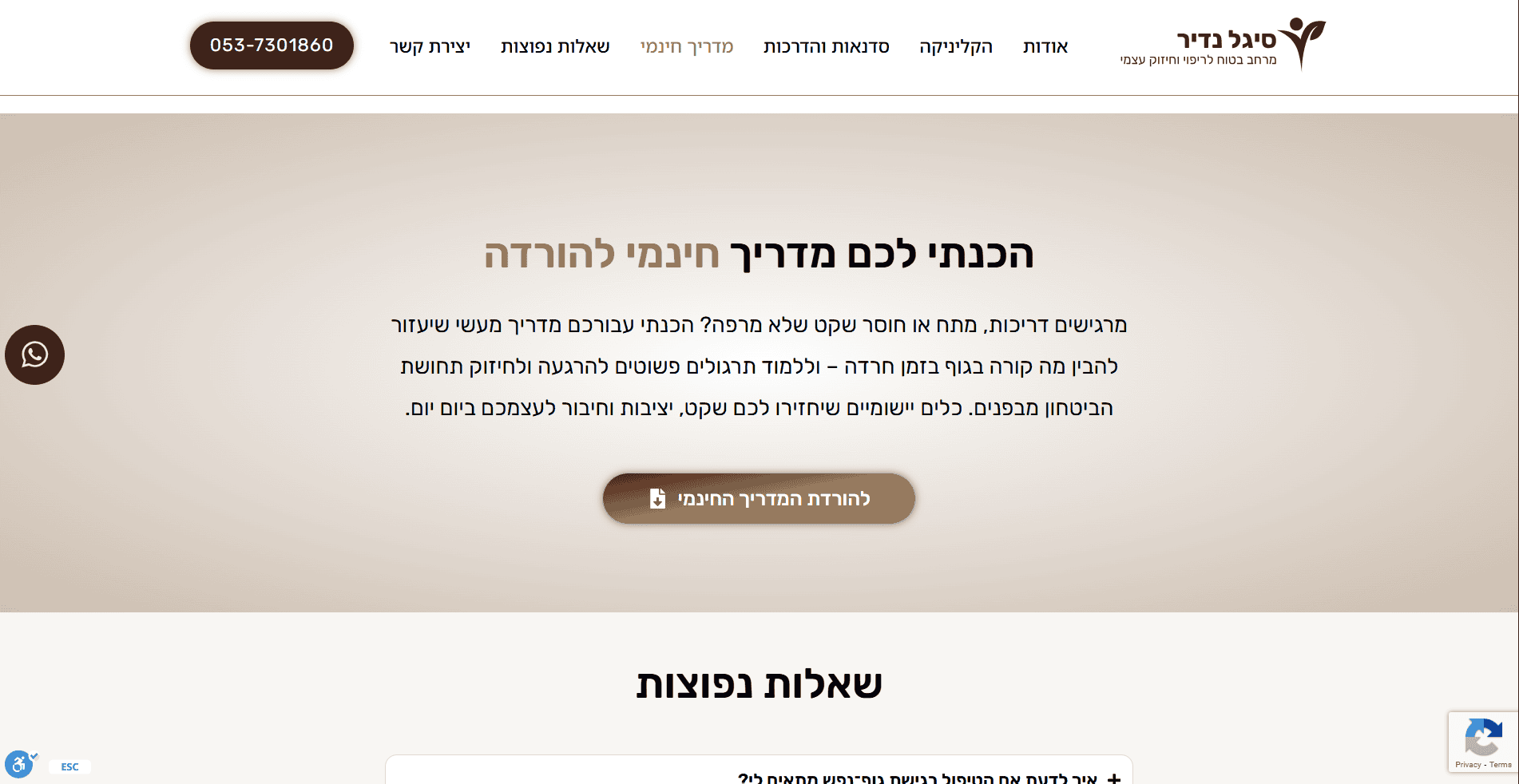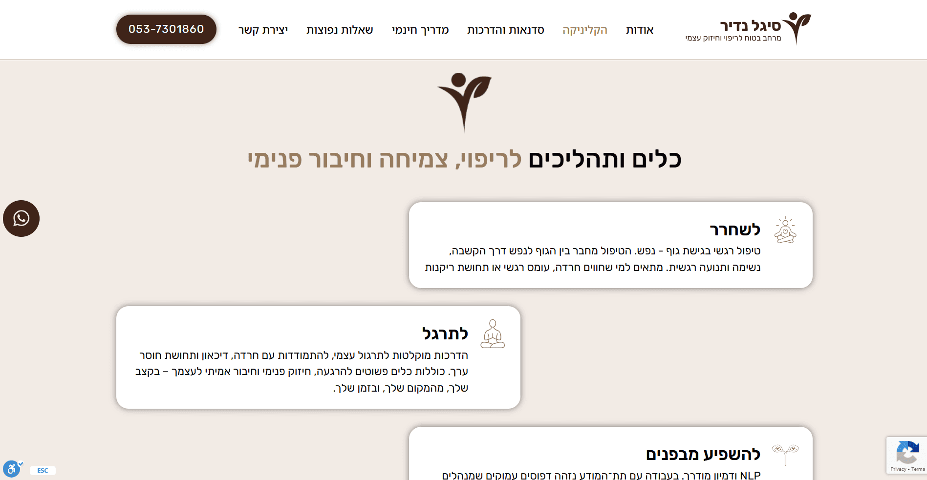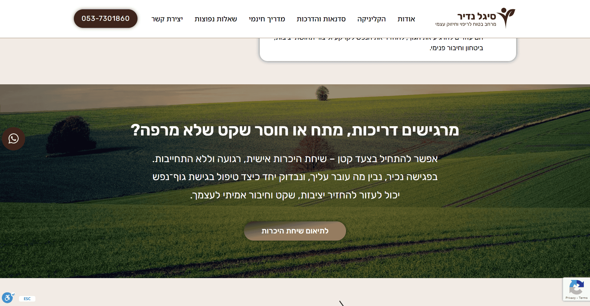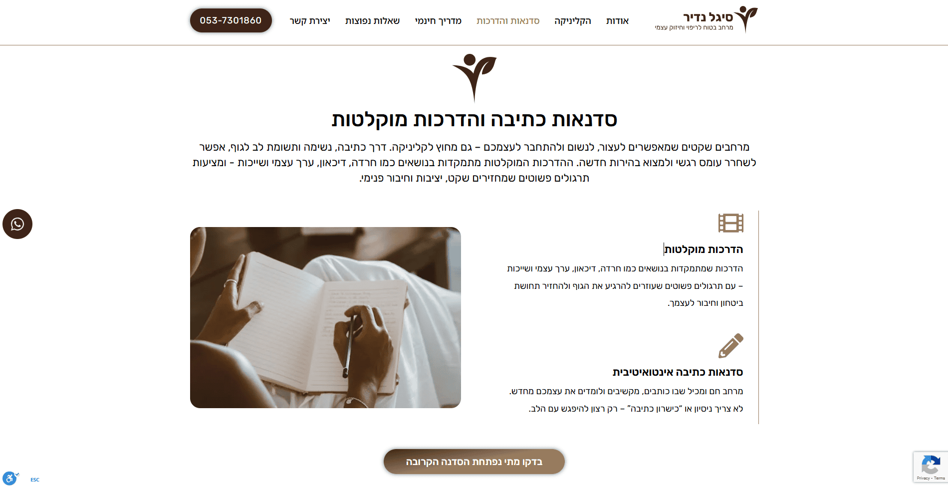 בניית אתר תדמית עבור סיגל נדיר, פסיכותרפיסטית מוסמכת בגישת גוף־נפש המתמחה בליווי גברים ונשים החווים חרדה, עומס רגשי, דיכאון ומשברי חיים. האתר מציג בצורה ברורה את הגישה הטיפולית האינטגרטיבית, הכוללת עבודה עם הגוף, NLP, דמיון מודרך, פרחי באך, תרגולי נשימה וכתיבה אינטואיטיבית. הפרויקט כלל עיצוב רגוע ונקי, יצירת חוויית משתמש תומכת, הצגת תהליכי טיפול וכלים מעשיים, אזור סדנאות והדרכות מוקלטות, מדריך חינמי ומשולב טפסי יצירת קשר שמניעים לפעולה בצורה עדינה ומדויקת.